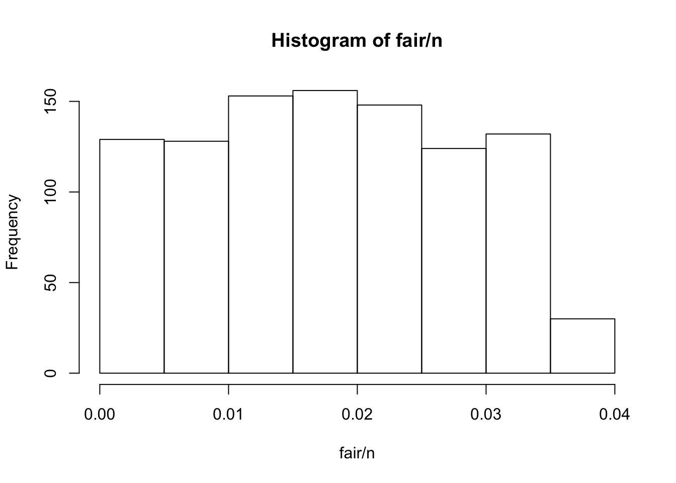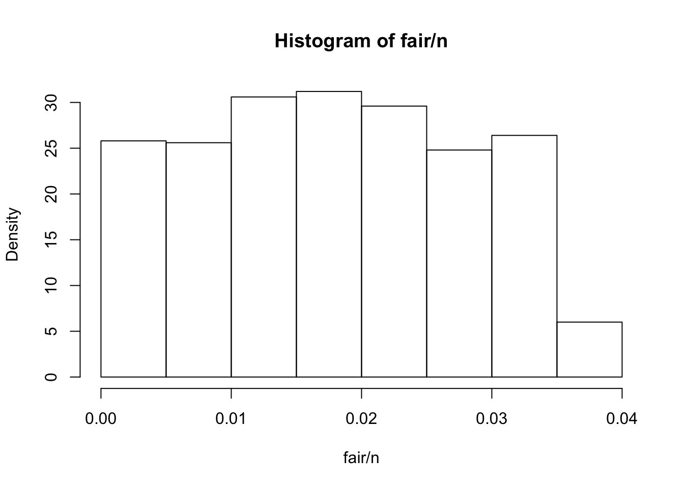 ここまでで,ルーレットを1000回まわした結果をサンプルとしたデータが作成された。 それでは,1が出た回数を数えてみましょう。 sum()を用いてfair==1の個数を足し合わせる。