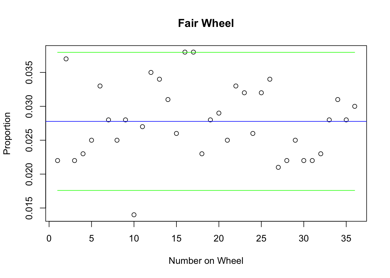 plot(1:36,y ,xlab="Number on Wheel", ylab="Proportion", main="Fair Wheel")