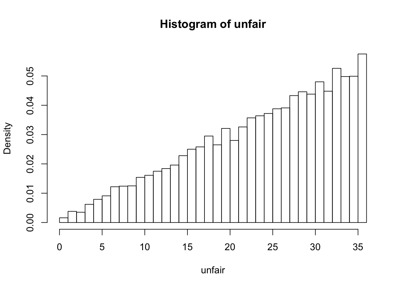 hist(unfair,breaks=0:36,probability=TRUE) # ヒストグラム
