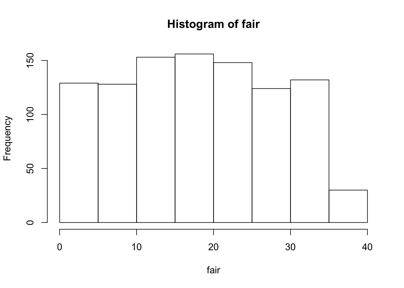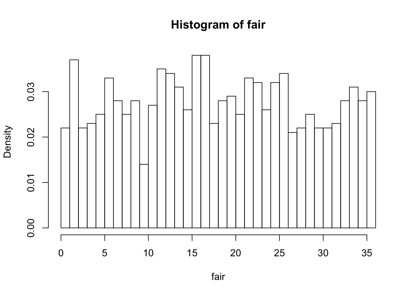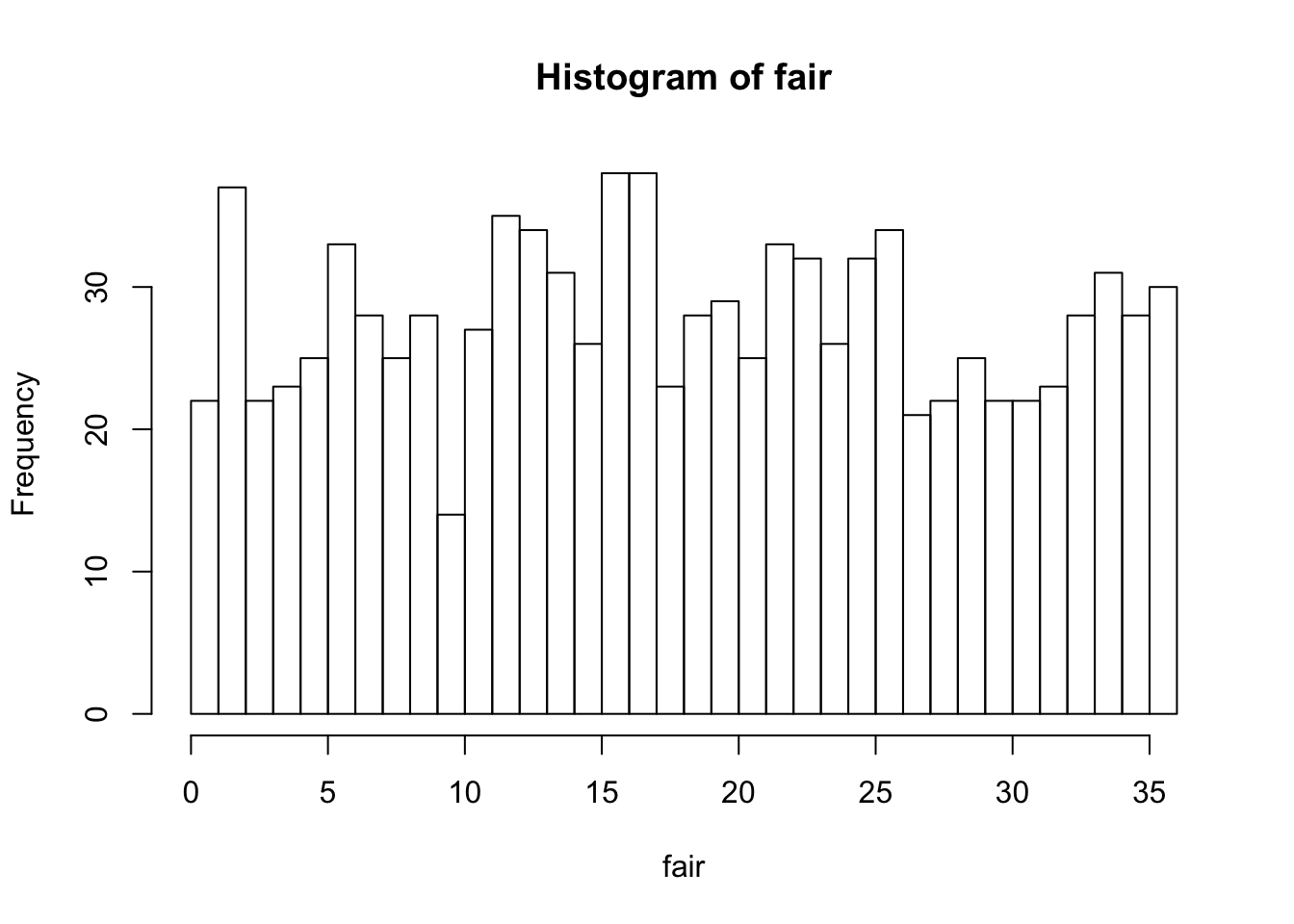 hist(fair,breaks=0:36) # 幅を0から36の1刻みにする。